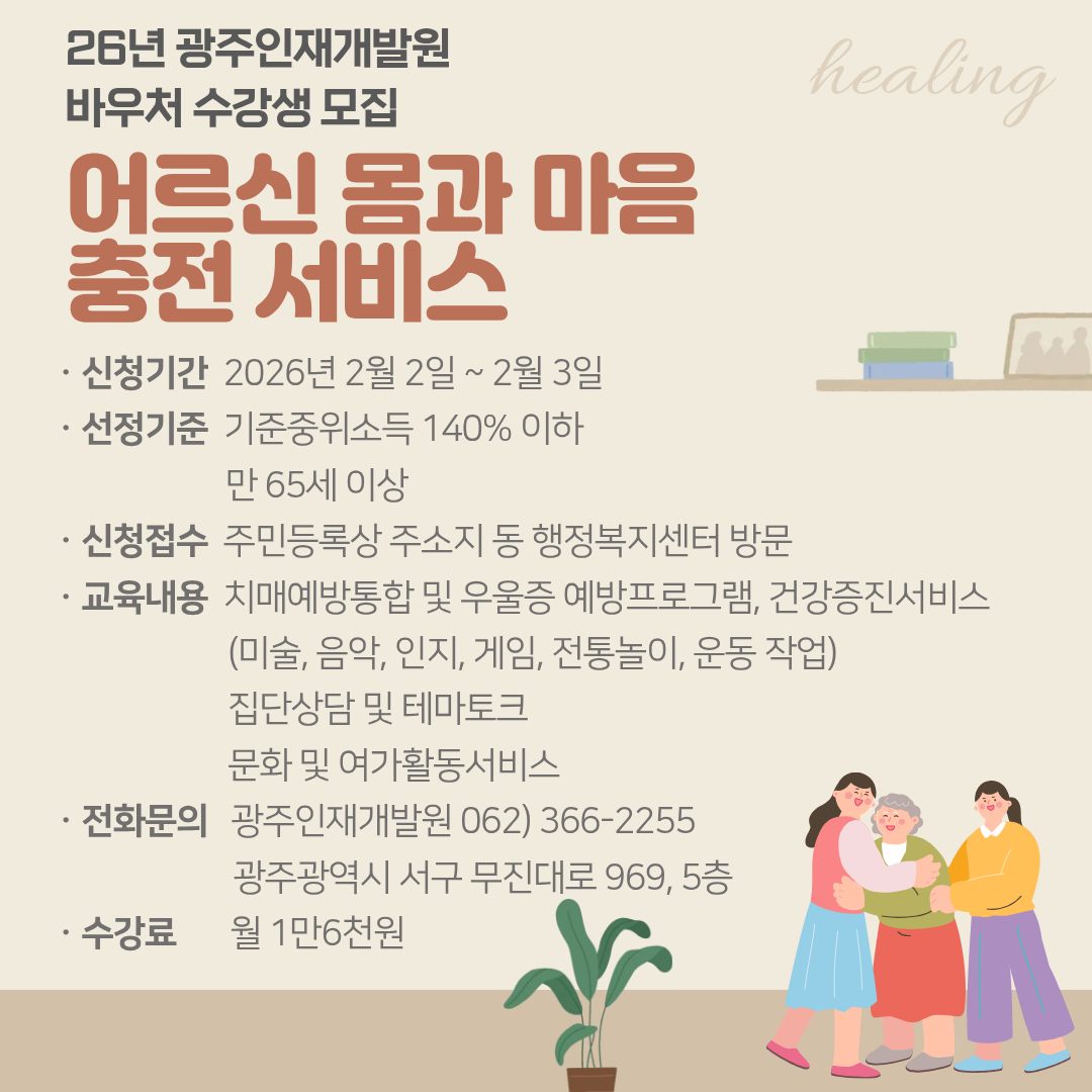 2026³â ±¤ÁÖÀÎÀç°³¹ß¿ø ¹Ù¿ìó ¼ö°»ýÀ» ¸ðÁýÇÕ´Ï´Ù. 2026³â ±¤ÁÖÀÎÀç°³¹ß¿ø ¹Ù¿ìóīµå "¾î¸£½Å ¸ö°ú ¸¶À½ ÃæÀü ¼ºñ½º" 1.½Åû±â°£: 2026³â2¿ù2ÀÏ~2¿ù3ÀÏ 2.¼±Á¤±âÁØ: ±âÁØÁßÀ§¼Òµæ 140% ÀÌÇÏ ¶Ç´Â ¸¸ 65¼¼ ÀÌ»ó 3.½ÅûÁ¢¼ö: Áֹεî·Ï»ó ÁÖ¼ÒÁö µ¿ ÇàÁ¤º¹Áö¼¾ÅÍ ¹æ¹® 4.±³À°³»¿ë: Ä¡¸Å¿¹¹æÅëÇÕ ¹× ¿ì¿ïÁõ ¿¹¹æÇÁ·Î±×·¥ °Ç°ÁõÁø¼ºñ½º(¹Ì¼ú, À½¾Ç, ÀÎÁö, °ÔÀÓ, ÀüÅë³îÀÌ, ¿îµ¿ ÀÛ¾÷) Áý´Ü»ó´ã ¹× Å׸¶ÅäÅ© ¹®È ¹× ¿©°¡È°µ¿ ¼ºñ½º 5.¼ö°·á: ¿ù 1¸¸6õ¿ø 6.Àüȹ®ÀÇ: ±¤ÁÖÀÎÀç°³¹ß¿ø 062-366-2255 *ÁÖ¼Ò: ±¤ÁÖ±¤¿ª½Ã ¼±¸ ¹«Áø´ë·Î 969, 5Ãþ 7.½Åû¹æ¹ý: ±¤ÁÖÀÎÀç°³¹ß¿ø »ó´ã -> °üÇÒ ÇàÁ¤º¹Áö¼¾ÅÍ(µ¿»ç¹«¼Ò) ¹æ¹®Á¢¼ö |